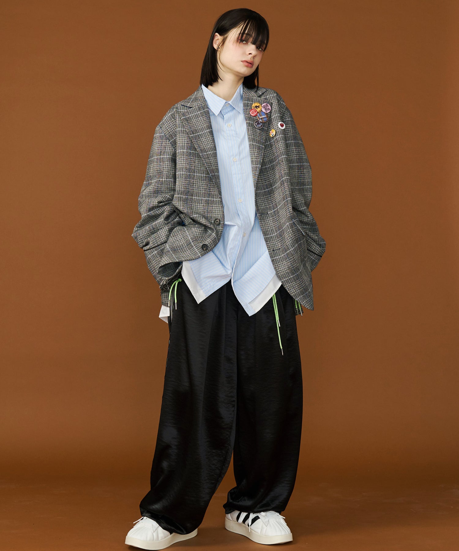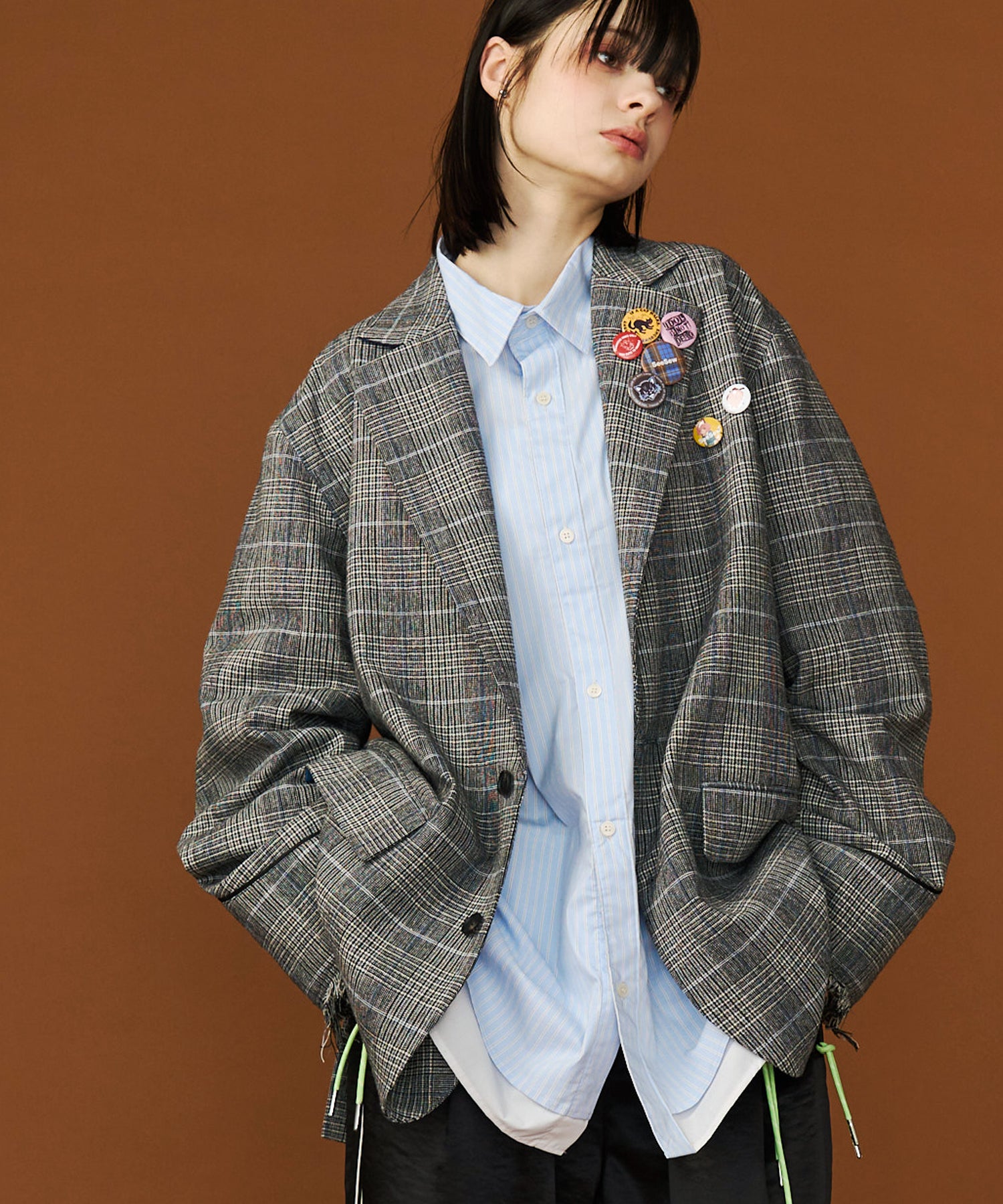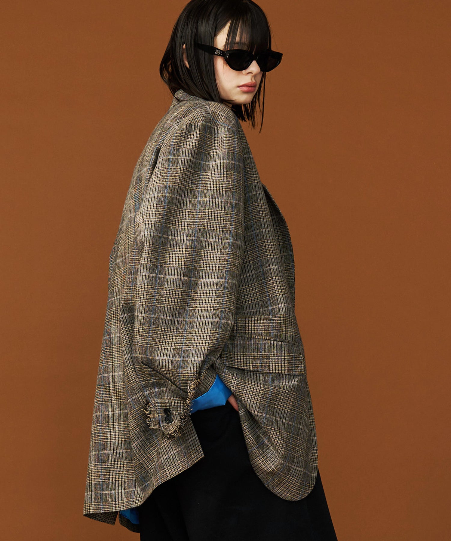 ◾️オーバーサイズながら肩幅をタイトに設計することで、シックで大人びたシルエットを演出。力強い太めのラペルが、クラシックでパンキッシュなムードを加速させます。