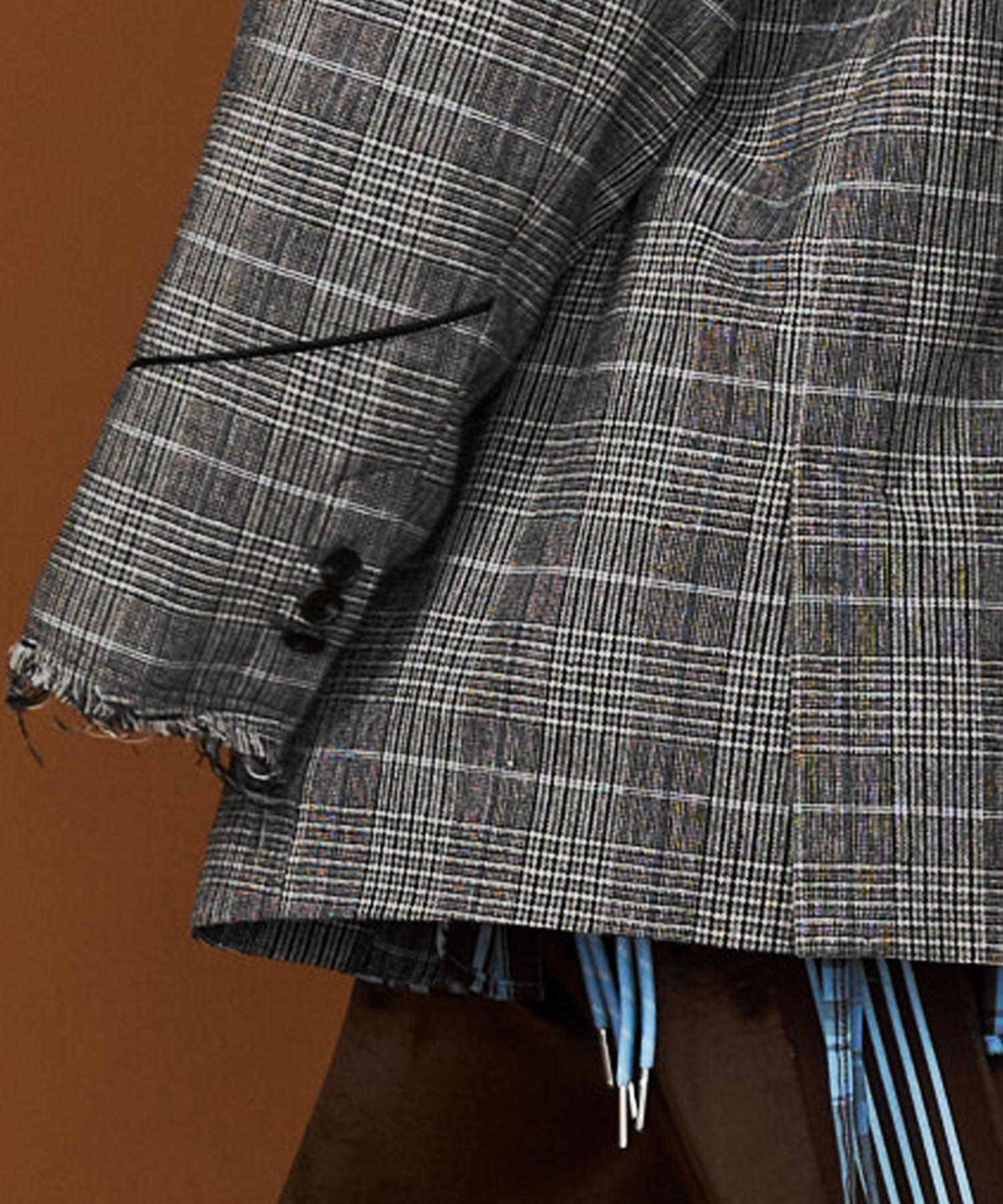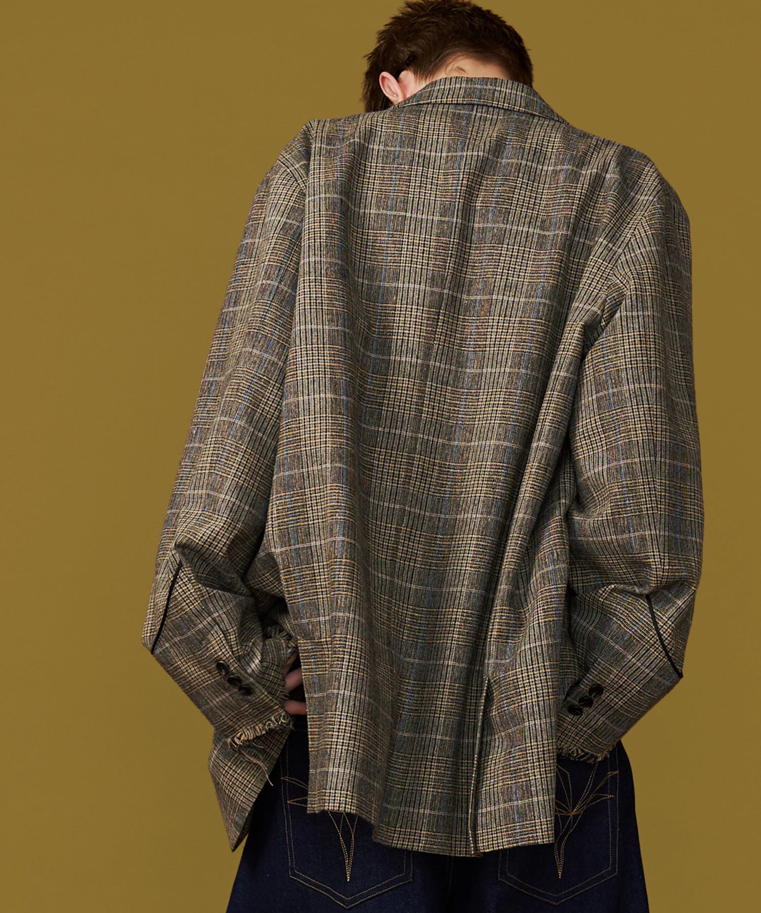 ◾️ブリティッシュなチェック生地に対し、袖口には大胆な「切りっぱなし加工」を採用。ほつれた糸が織りなす退廃的な表情が、計算されたグランジテイストを主張します。ウール混ながらも軽量で着やすく、季節を問わずご着用いアイテムです。
