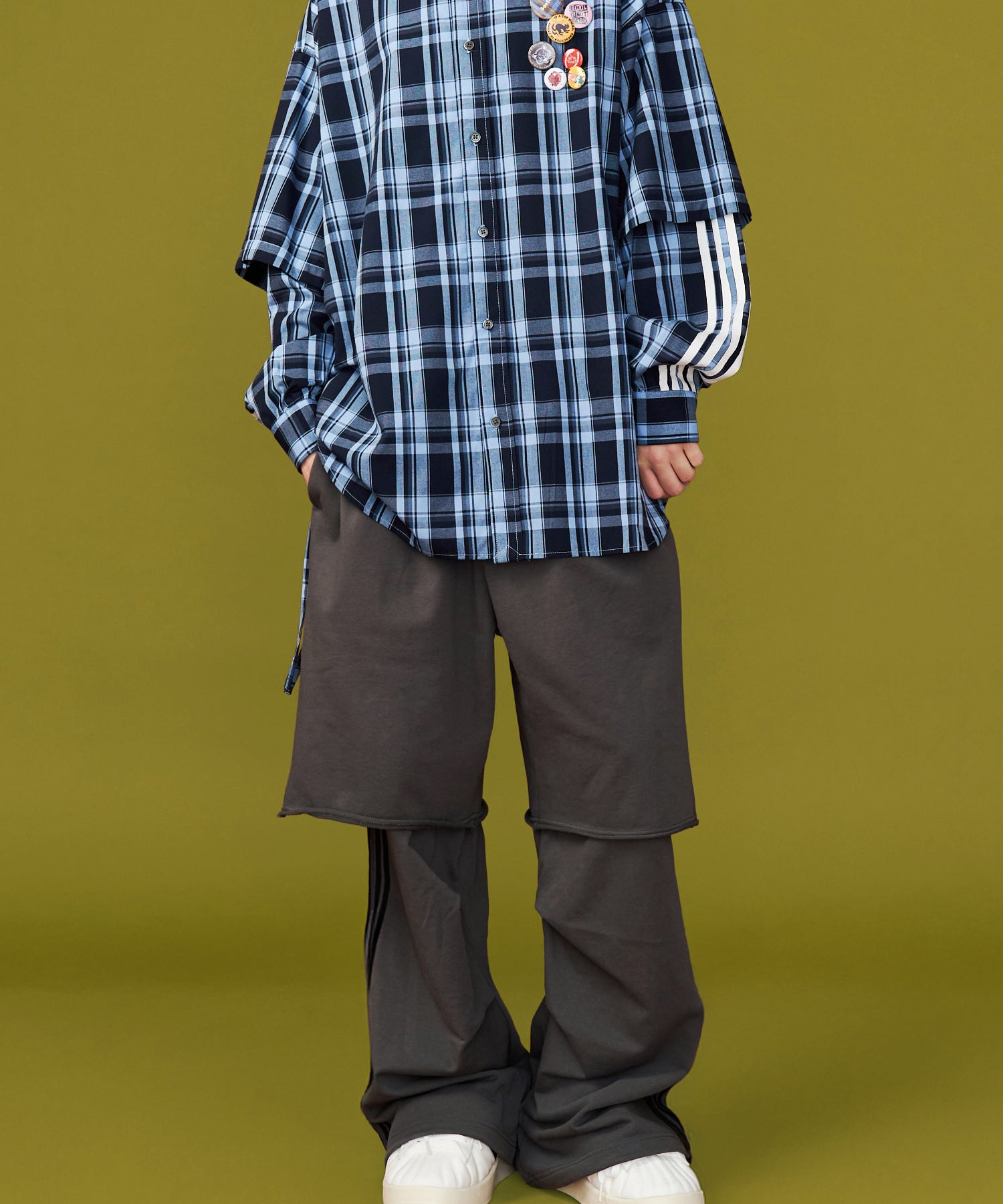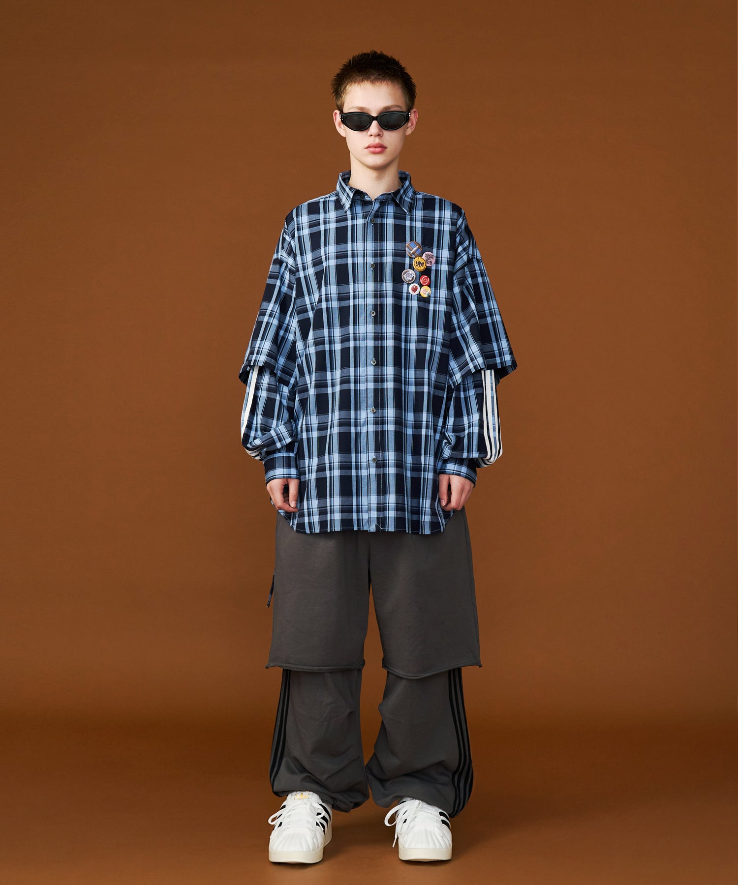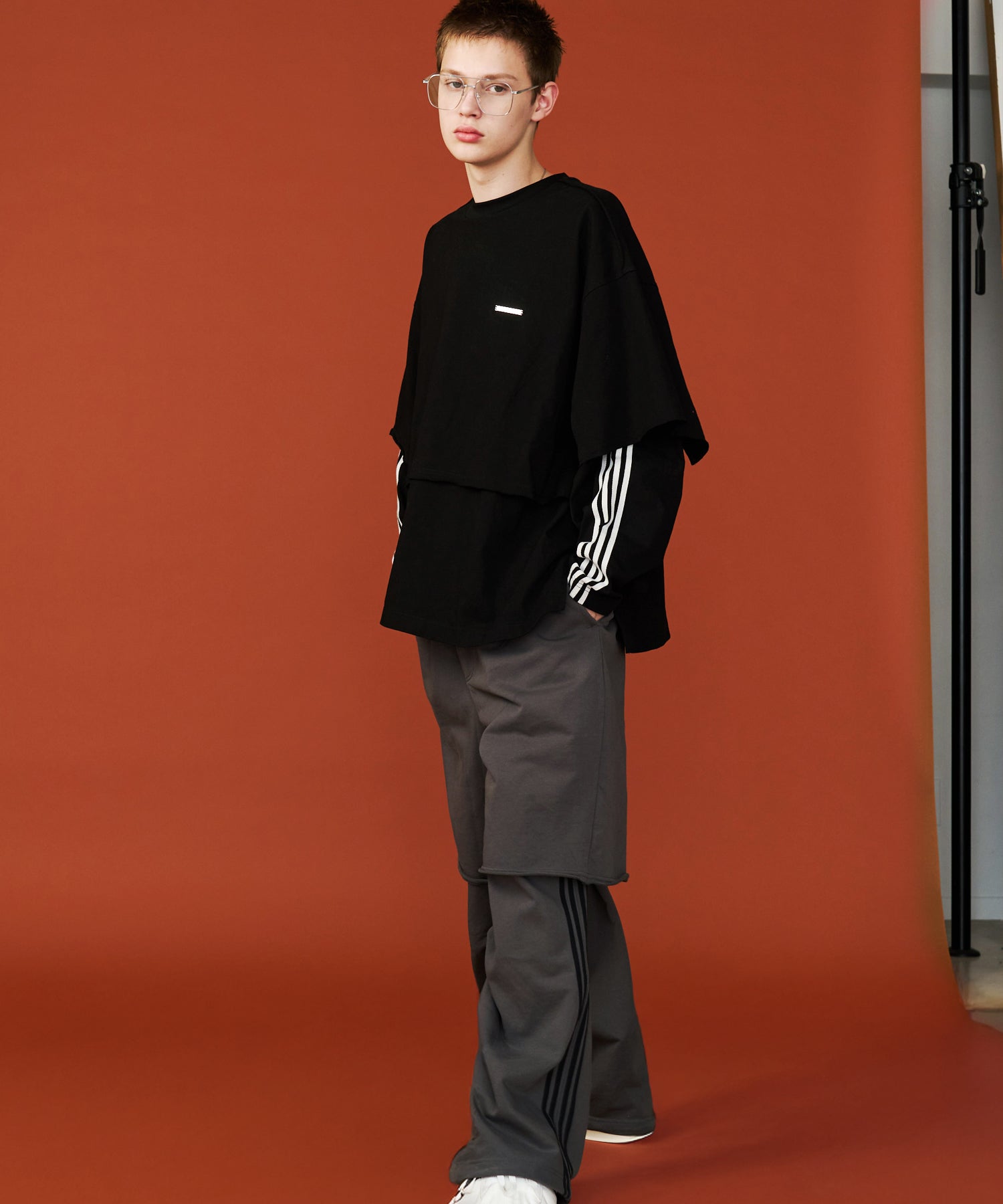 ◾️SeeSewが得意とするレイヤードの手法を、ボトムスへと大胆にクロスオーバー。ショーツとロングパンツを構造的に一体化させた、一本でスタイリングが完結するハイブリッド・スウェットパンツです。