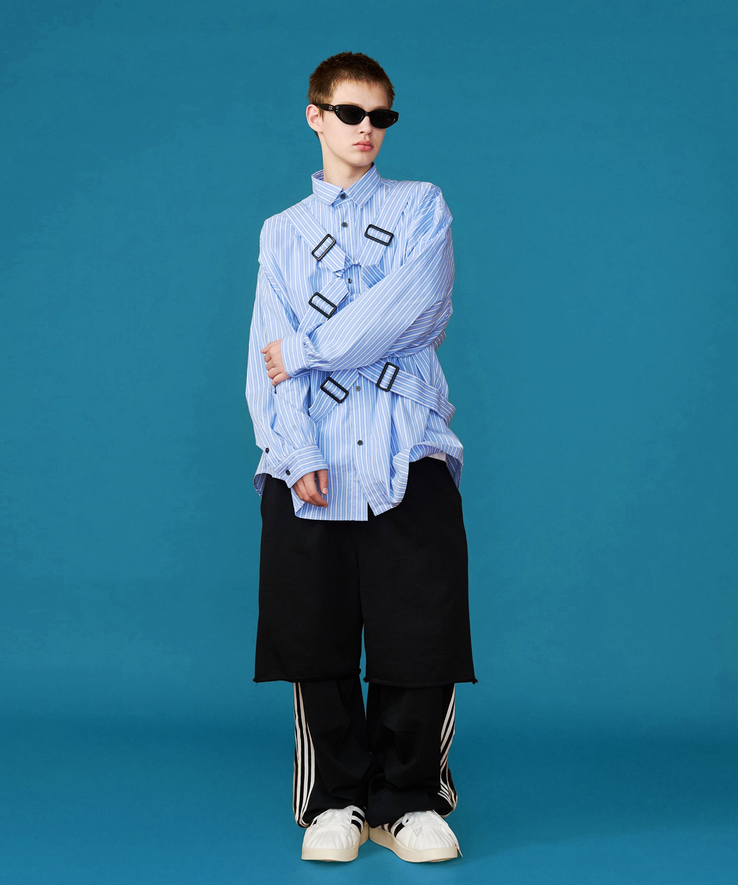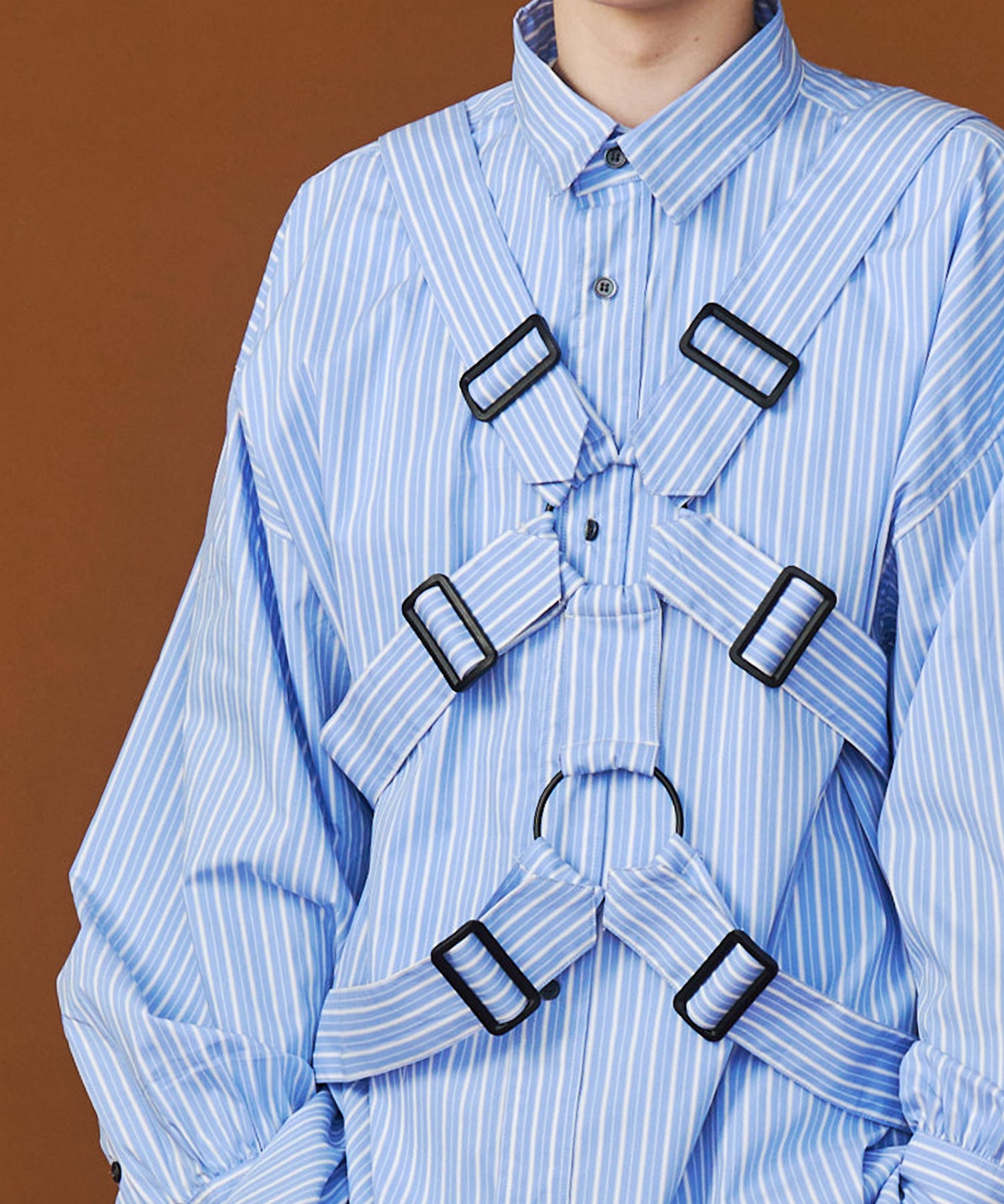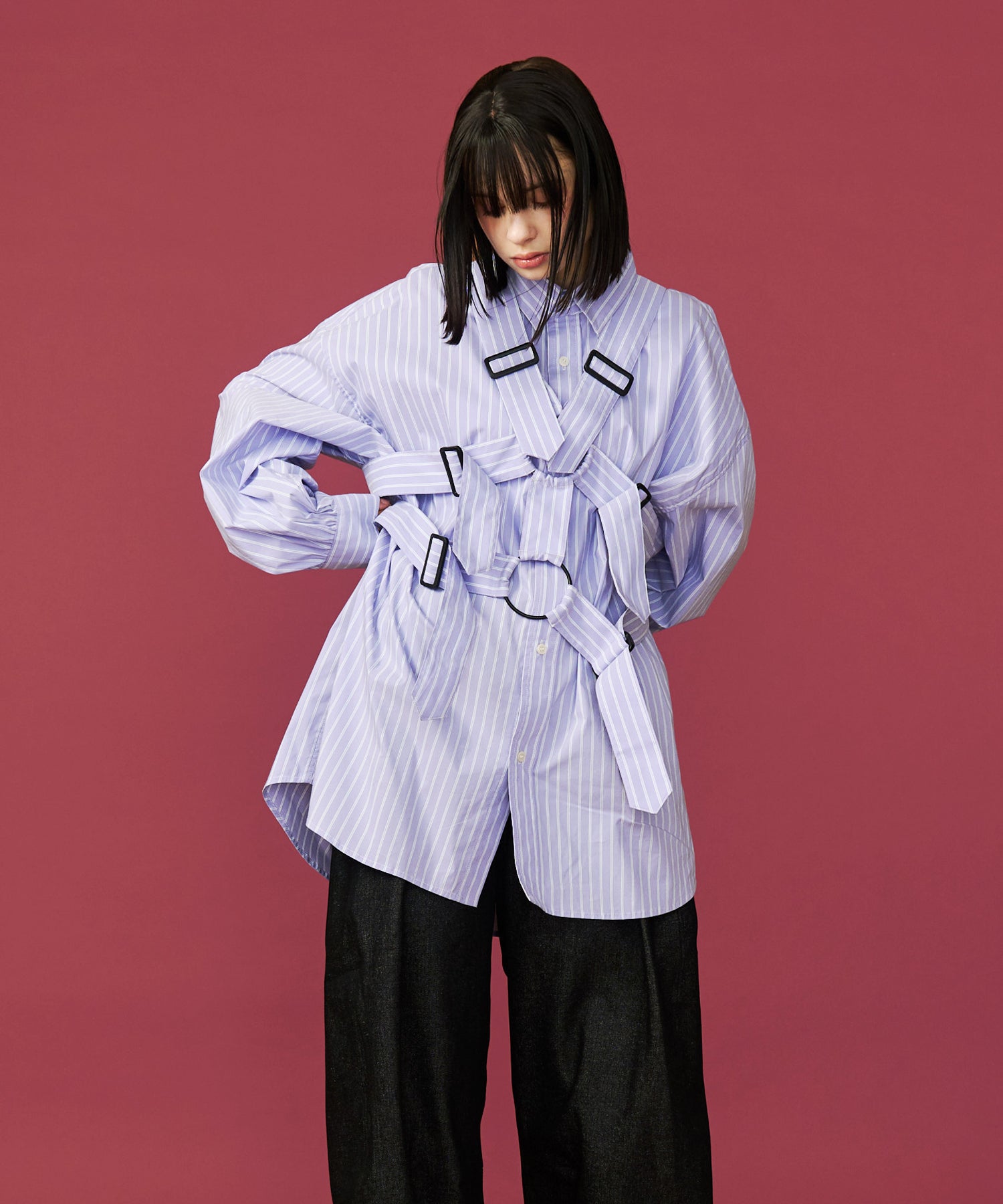 ◾️従来の重厚なチェック柄から一転、今シーズンは春の陽光に映える爽やかな「ストライプ素材」を採用。クリーンで知的なシャツ地に、あえて過剰なベルトディテールを衝突させることで、SeeSewならではの「ポジティブな違和感」を演出しました。