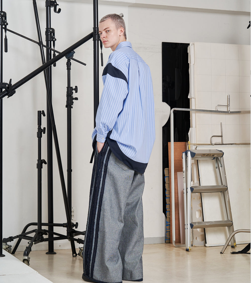 ◾️毎シーズンご好評のブロッキングシャツをベーシックに着やすいフィニッシュでブラッシュアップ。クリーンで着回しの良いのストライプを採用し、レトロなスタジャンをイメージしたブロッキングカラーをドッキングした、ドメスティックなルックスのオーバーシャツ。