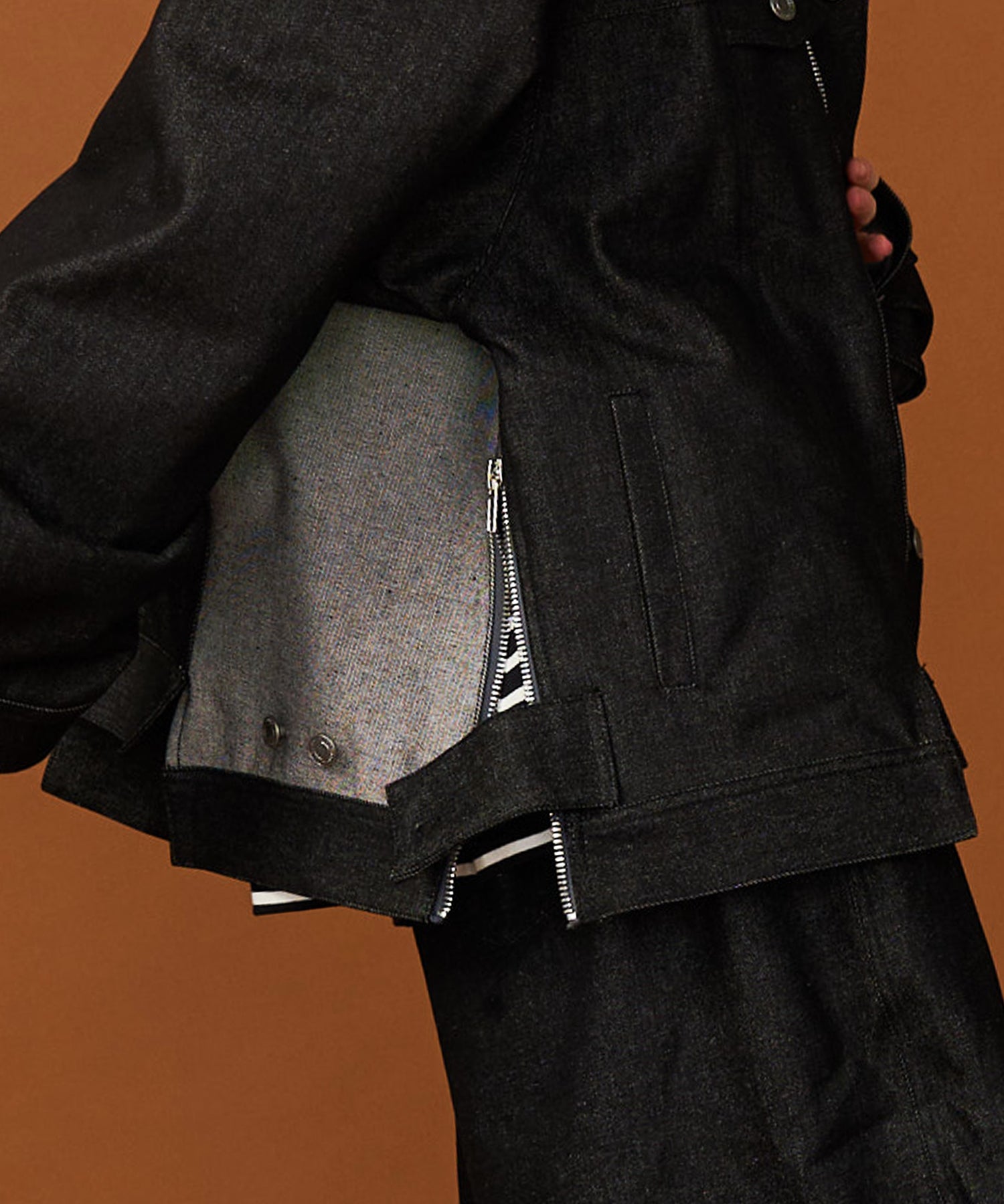 ◾️両サイドの裾に配されたファスナースリットは、インナーとのレイヤードを楽しめるだけでなく、Aライン気味のシルエットへと可変できるタクティカルディテール。