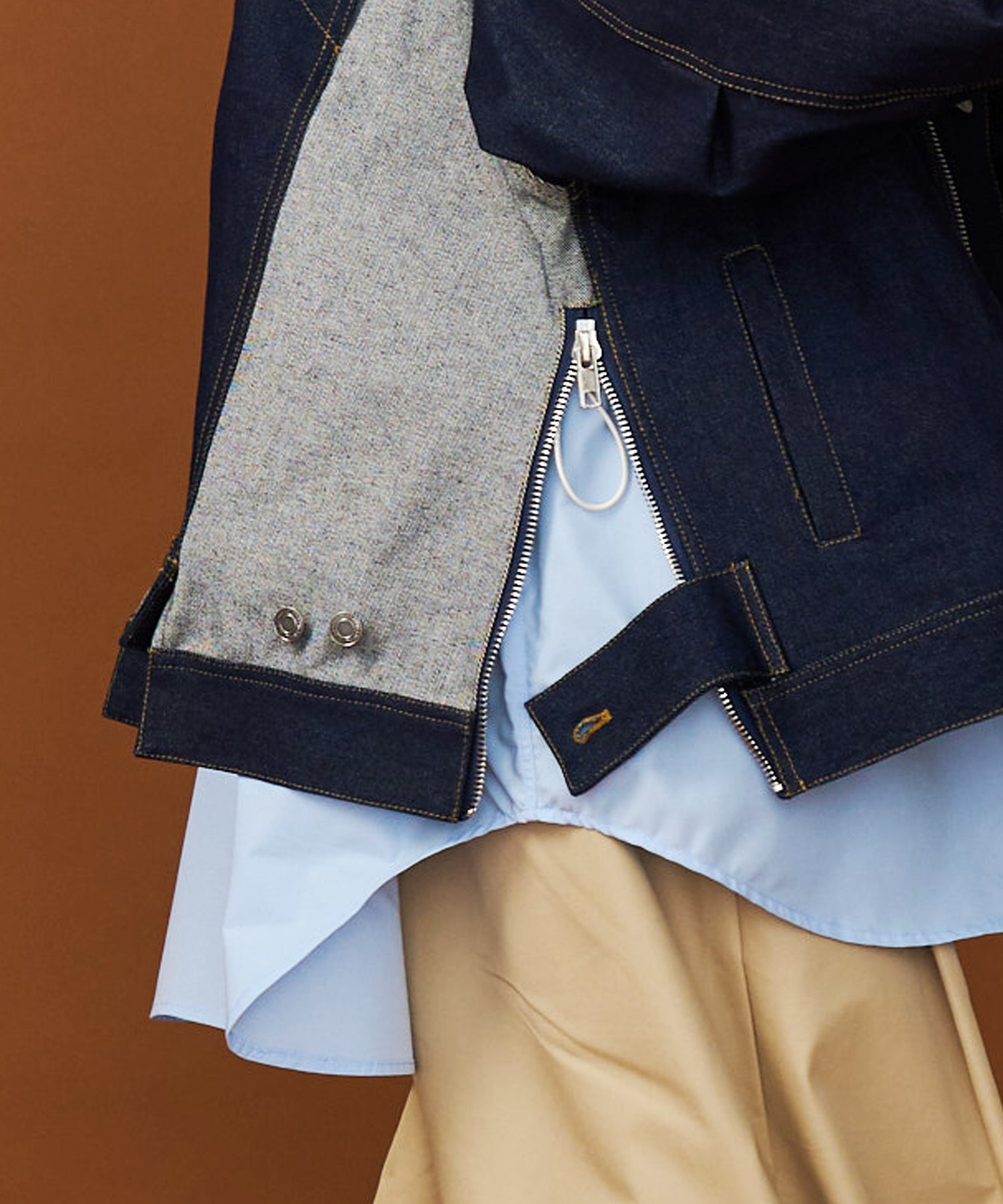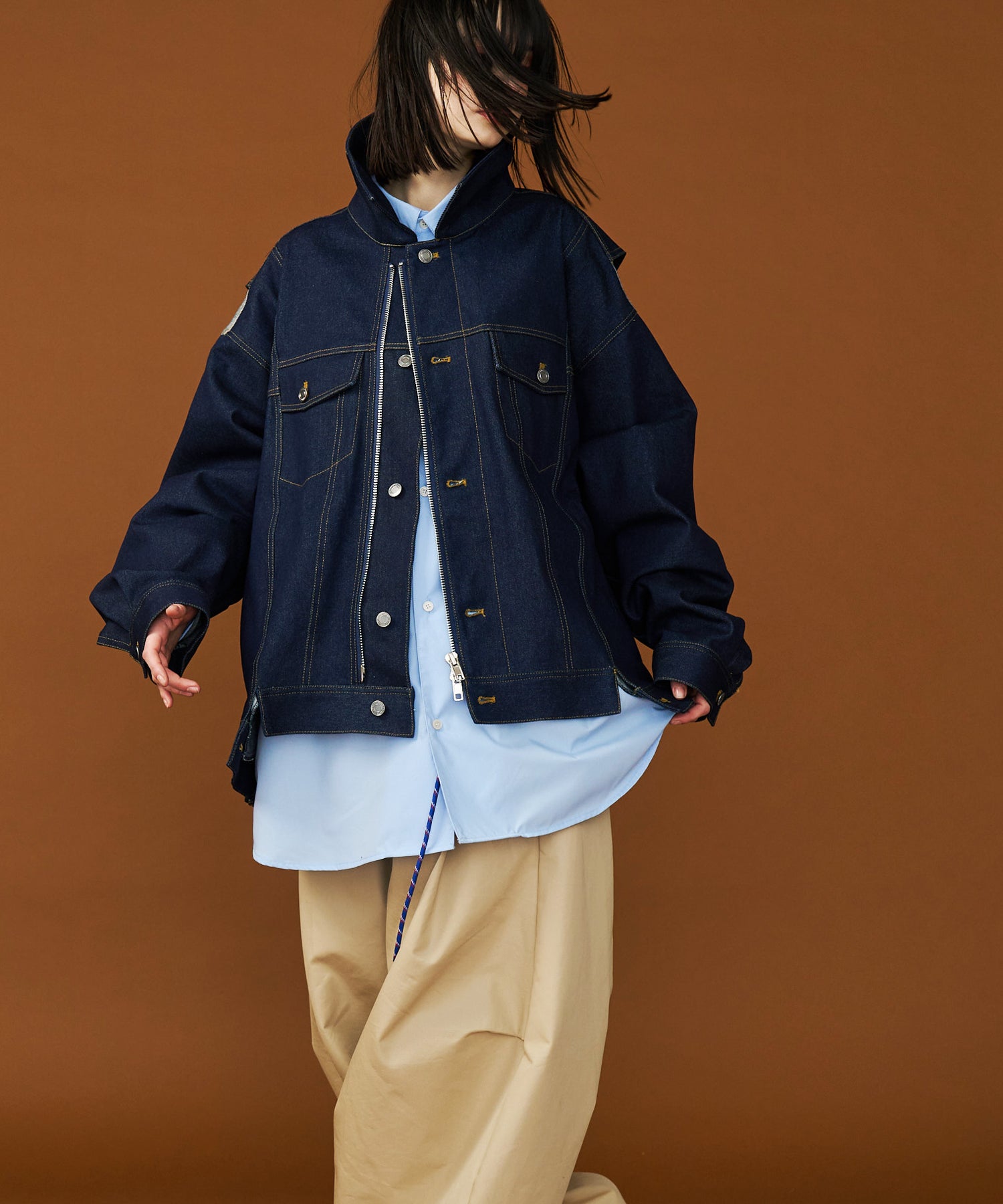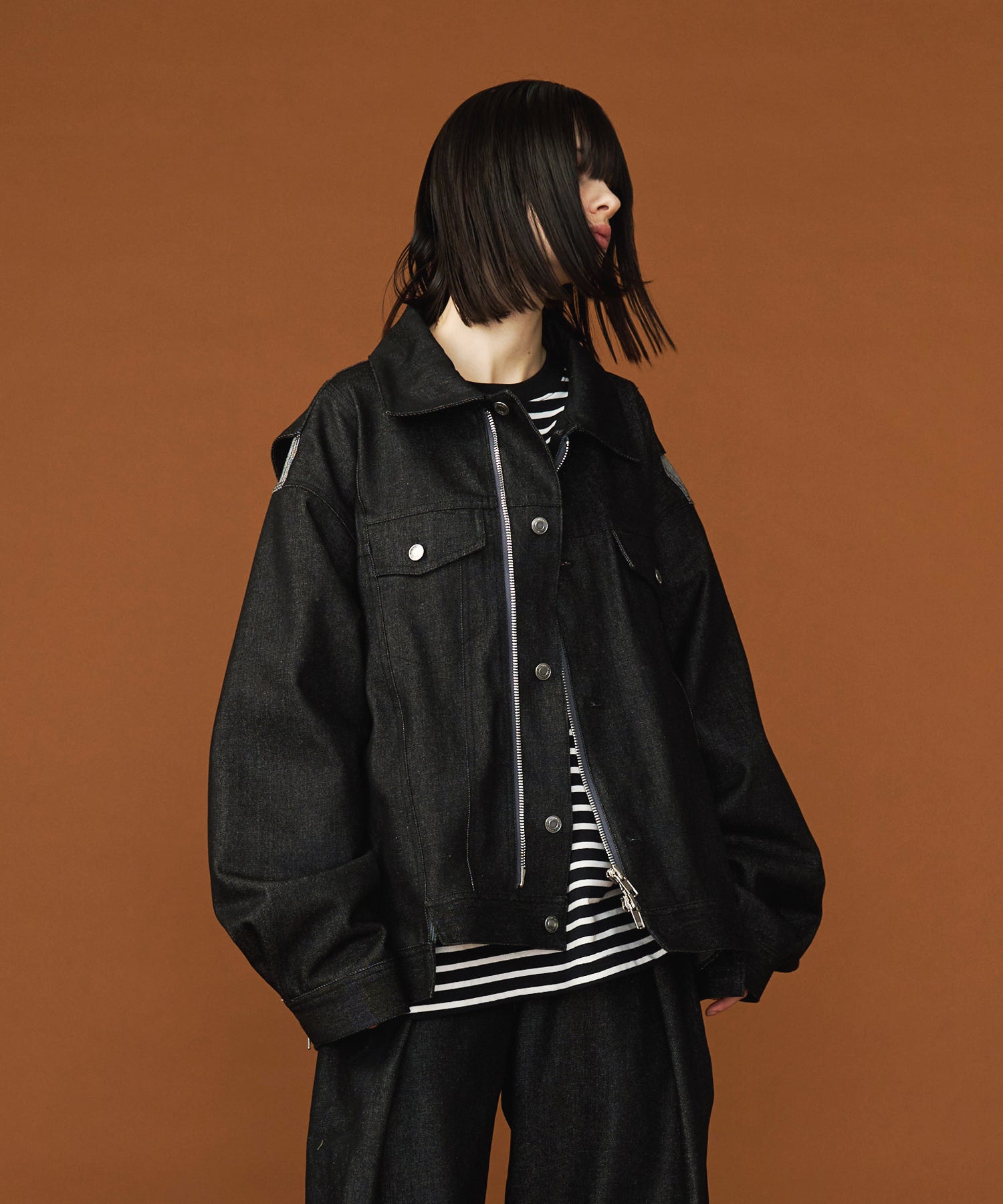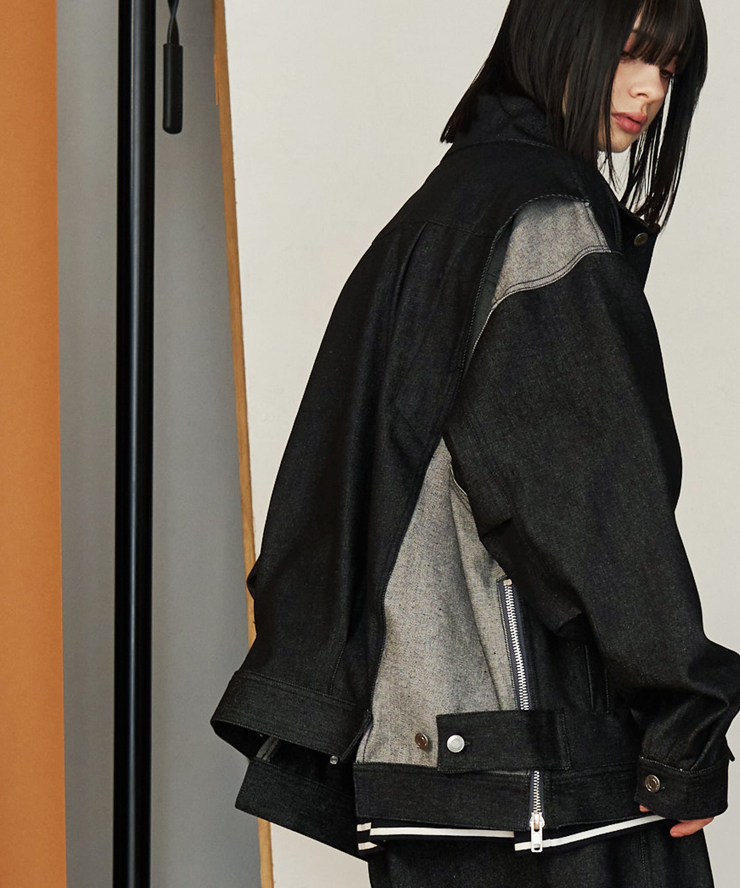 ◾️デニムジャケットの表情を残しつつ、フロントにはライダースジャケットを思わせるダブルジッパーを採用。"裾やポケットが段違い"になったブロッキングデザインが、どの角度からでも目を引くシーズンを問わない主役アウターです。